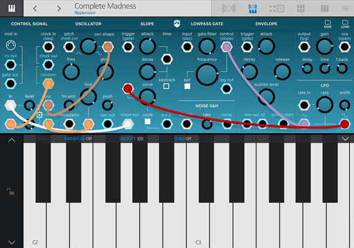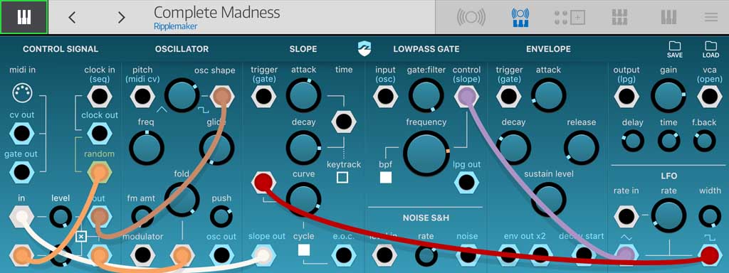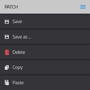 TAP THE HAMBURGER BUTTON in the top right corner to open the menu. Use the menu to save, delete, copy and paste patches. Copy/paste works between other AU Instruments and projects. |