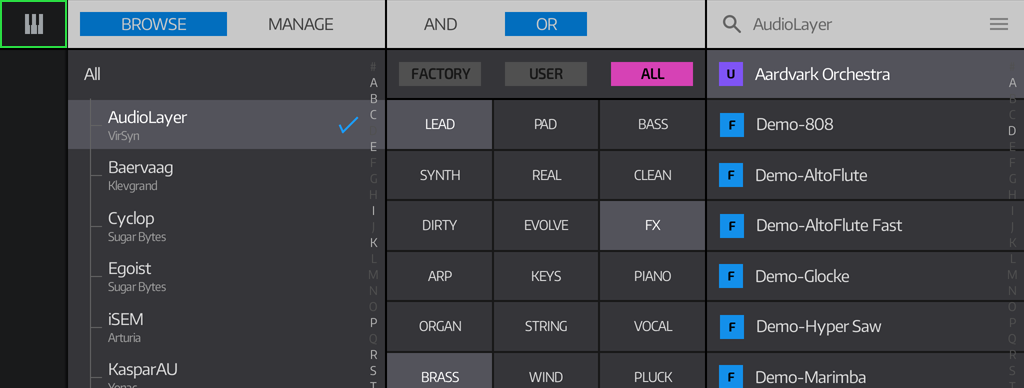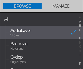 BROWSE MODE The tick icon shows the AU which is currently loaded. TAP on an item to select the AU you'd like to browse. You can browse the patches for all AUs by selecting All, or narrow your search down by selecting a particular AU. DOUBLE TAP on an AU to load its default factory patch. |