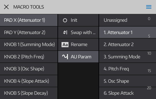 Use the menu to initialize, swap or rename macro controls, or to map them to a modulation destination. Some AUs provide a list of 'main parameters'. If so, the AU Instrument will automatically set up the macro controls for the first 10 parameters in the list. |