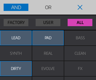 Selects the type of sound you'd like to browse according to its tag attributes. Note: Only user patches support tag attributes. When AND mode is selected, the patch must contain all the selected tags in order to be shown. When OR mode is selected, the patch must contain at least one of the selected tags in order to be shown. |