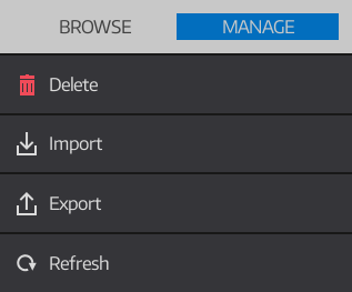 MANAGE MODE Use this mode to manage your user patches. When MANAGE is selected, the patch list allows multiple selection so that you can easily perform bulk operations. The AU Instrument automatically keeps its patch database up to date, but if you think you have some missing patches then you can use the Refresh option to manually rebuild its database. For Import and Export options, see Integration and Sharing. |