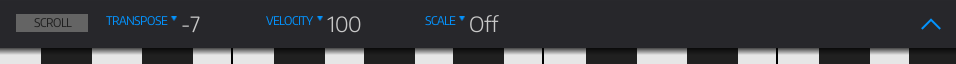 Use the bar to lock or unlock HORIZONTAL SCROLLING or to set the keyboard's TRANSPOSE, VELOCITY or SCALE.