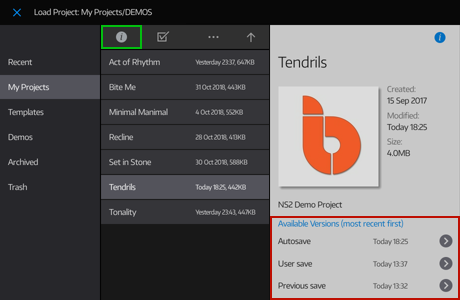 As discussed in the Overview, NanoStudio maintains up to 3 versions of each project. To see if there are any other versions available, use the File Browser's info button (highlighted in GREEN to show the info pane (highlighed in RED). Tap on one of the arrow buttons to load a different version. |